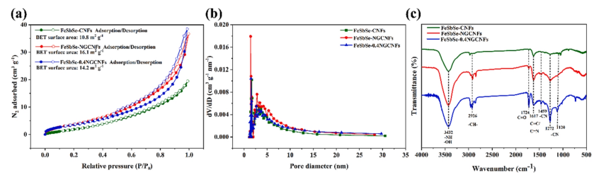 圖4. (a–b)FeSbSe-CNFs、FeSbSe-NGCNFs 和 FeSbSe-0.4NGCNFs 的 Brunauer–Emmett–Teller 曲線和相應(yīng)的孔徑分布曲線;(c)FeSbSe-CNFs、FeSbSe-NGCNFs 和 FeSbSe-0.4NGCNFs 的 FTIR 光譜。