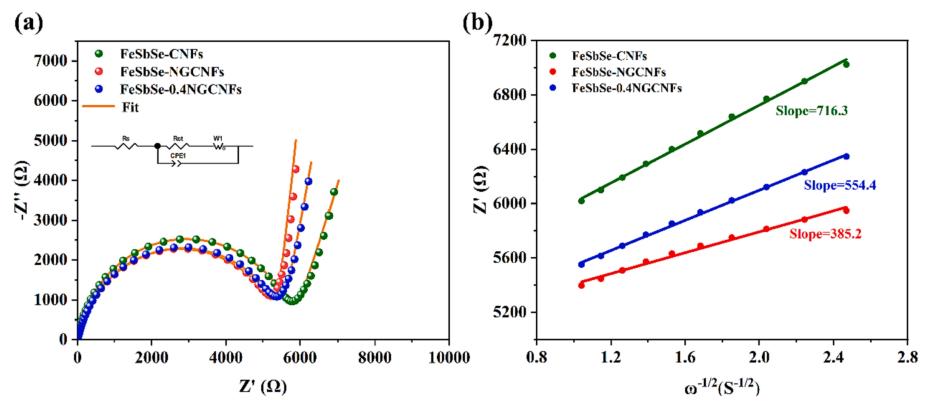圖7. (a)FeSbSe-CNFs、FeSbSe-NGCNFs 和 FeSbSe-0.4NGCNFs 電極的 EIS 奈奎斯特圖和(b)Z′ 和 ω-1/2 之間的線性擬合。