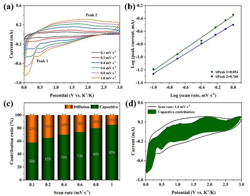 圖8. (a)FeSbSe-NGCNFs 在不同掃描速率下對 PIBs 的 CV 曲線。(b)FeSbSe-NGCNFs 的峰值電流與掃描速率的線性關(guān)系。(c)FeSbSe-NGCNFs 的電容和擴(kuò)散控制容量的歸一化比例。(d)FeSbSe-NGCNFs 在 1.0 mV s-1時的電容貢獻(xiàn)曲線。