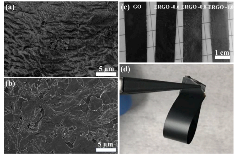 圖2. (a) GO、(b) ERGO -0.8 樣品、(c) ERGO 薄膜的典型 SEM 圖像,c圖從左到右分別為 GO、ERGO -0.6、ERGO -0.8、ERGO -1.0,以及 (d) ERGO -0.8 的柔韌性。