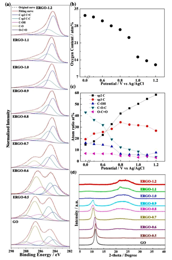 圖4. GO和ERGO的特性:(a)在不同電位下還原的ERGO薄膜的C 1s XPS曲線,(b)通過元素分析確定的氧含量,(c)ERGO薄膜中含氧基團和非含氧基團的濃度與還原電位的關系,(d)在不同電位下還原的ERGO的XRD光譜。
