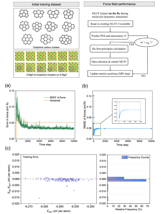 21@MgO獲得的ML-FF進行訓練和驗證。(a)每個原子的力(BEEF)的貝葉斯誤差估計和VASP中動態ML算法為ML- FF的生成設定的閾值標準。(b)相對于DFT結果的力預測的均方根誤差(RMSE)。(c) ML-FF MD模擬中132個隨機選擇結構的能量評估與DFT相比的誤差。