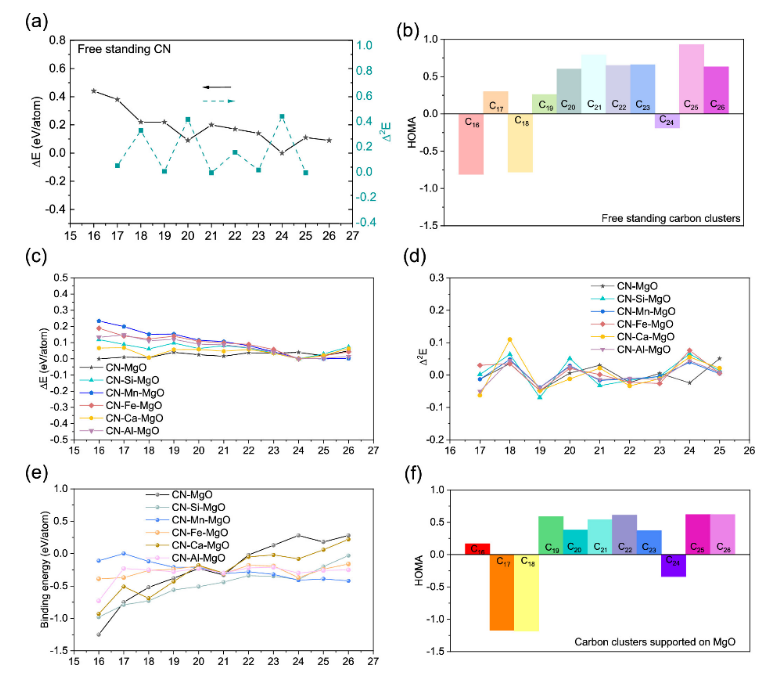 n (n = 16-26)在X摻雜MgO (X = Si, Mn, Fe, Ca, Al)上的結合能。(f) Cn@MgO的HOMA指數值(n = 16-26)。使用預訓練的ML-FF進行靜態優化。