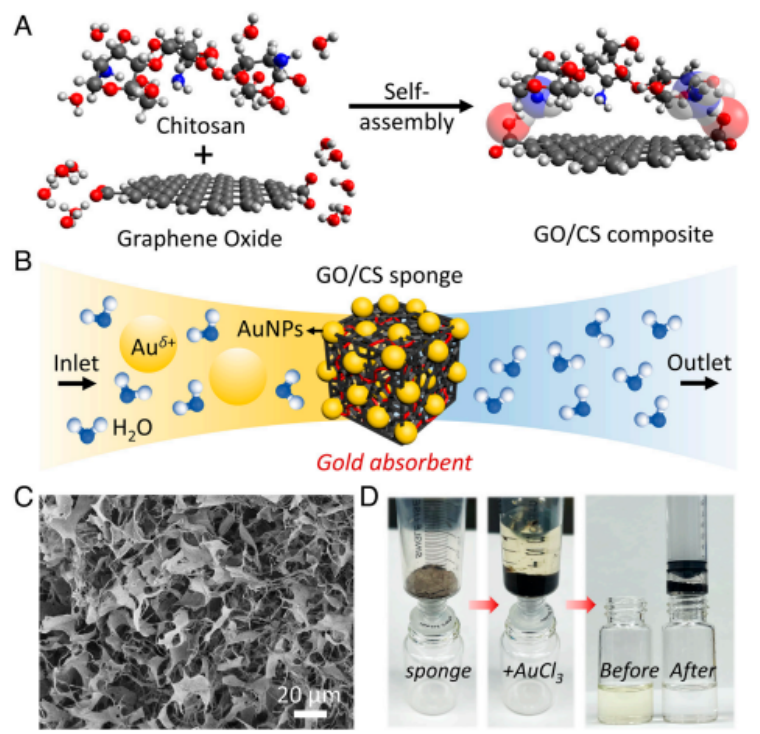 圖 1. GO/殼聚糖海綿用于金的吸附和過濾。(A)通過密度泛函理論計算優化的 CS⋅⋅⋅GO 復合物的幾何形狀。(B)用于超快速高效吸附/提取金的 GO/CS 海綿示意圖,δ = 1 或 3。(C)GO/CS5 海綿的 SEM 圖像。(D)照片顯示了裝入注射器的 GO/CS 海綿(左),然后加入 5 mL 200 ppm Au3+ 溶液(中)以及過濾前后實時顏色變化的可視化(右)。2.5 mg 海綿吸附劑以 0.14 g/g min 的吸附速率(詳見 SI 附錄表 S1)從 5 mL 中提取 200 ppm 的金需要大約 2.86 分鐘。