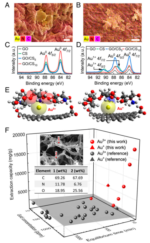 圖3. GO/CS海綿對Au+和Au3+的提取和還原。 (A和B) GO/CS海綿吸附Au3+ (A)和Au+ (B)的SEM/EDX圖像,EDX映射顯示金元素為黃色。 (C和D) Au3+ (A)和Au+ (B)吸附后原始GO、CS和GO/CS海綿上金納米粒子的4f XPS光譜。 (E) 通過密度泛函理論計算優化的CS2+…Au3+…GO2− (左)和CS2+…Au+…GO2− (右)復合物的最穩定幾何形狀。原子顏色符號:C—灰色,H—白色,O—紅色,H—白色,Au—黃色。 (F) 在Au3+(球體)和Au+(四面體)濃度、萃取平衡時間和萃取容量方面的金提取性能比較(詳情請參閱SI附錄,表S3)。插圖:通過 SEM/EDX 對 GO/CS 海綿進行元素分析。