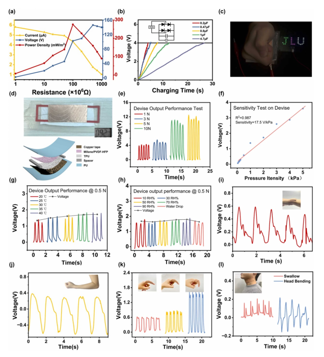 圖 4. 將TENG用于各種應用或檢測各種身體運動信號。(a)U-I-Power密度曲線。(b)MC-TENG充電能力測試。(c)用MC-TENG驅動發(fā)光二極管。(d)用于身體信號檢測的MC-TENG圖像。(e)器件輸出性能測試。(f)器件靈敏度測試。(g)不同溫度下的器件輸出。(h)不同濕度情況下器件的輸出性能。(i)手腕旋轉信號。(j)肘部彎曲信號。(k)不同手指彎曲角度的MC-TENG信號。(l)不同的喉部運動。