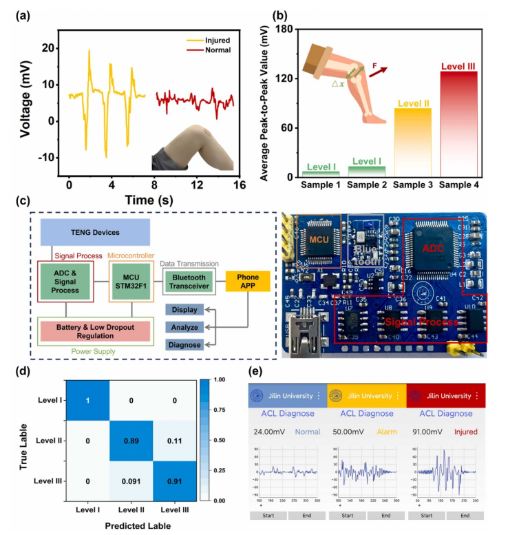 圖 5. ACL 損傷診斷系統(tǒng)設計。(a)MC-TENG 用于 ACL 損傷診斷的可行性。(b)患者數據摘要和 ACL 診斷的 ADT 模式。(c)檢測系統(tǒng)硬件設計。(d)ACL 診斷系統(tǒng)的混淆矩陣結果。(e)不同類型的診斷結果顯示在 APP 中。
