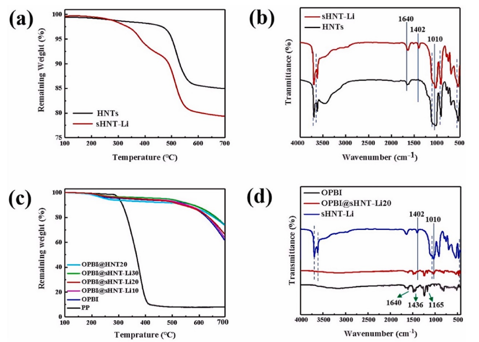 圖 2. (a)HNTs、sHNT-Li的TGA曲線和(b)FT-IR光譜;(c)隔膜的TGA曲線;(d)OPBI、OPBI@sHNT-Li20隔膜和sHNT-Li的FT-IR光譜。