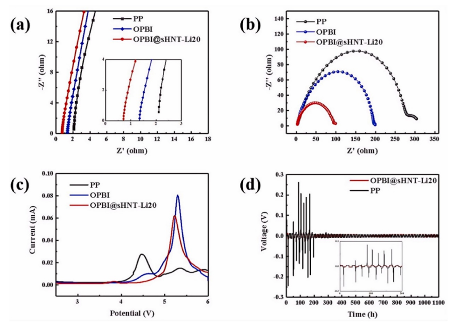 圖6. (a)隔膜夾在兩塊鋼板之間組裝的電池的交流阻抗;(b)夾在兩個鋰電極之間的對稱電池隔膜的界面電阻;(c)隔膜夾在 LiFePO4 正極和鋼板之間組裝的電池的 LSV;(d)Li/隔膜/Li 的鋰沉積/剝離循環(huán)穩(wěn)定性。