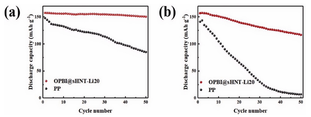 圖 9. 用 PP 和 OPBI@sHNT-Li 隔膜組裝的電池在(a)50 °C、0.5 C 和(b)90 °C、0.5 C 下的循環(huán)穩(wěn)定性。