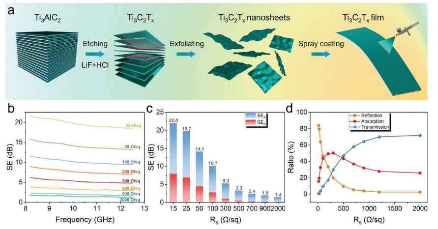 Fig 1. Ti3C2Tx 薄膜電極的制備和微波表征。a) Ti3C2Tx 薄膜制備過程的示意圖。b) 在 X 波段具有不同 Rs 的 Ti3C2Tx 薄膜的 EMI SE 值。c) 具有不同 Rs 的 Ti3C2Tx 薄膜的反射效能 (SER) 和吸收效能 (SEA) 值,其中 SER 和 SEA 之和等于總 SE。d) 計算 X 波段具有不同 Rs 的 Ti3C2Tx 薄膜的反射率、吸收率和透射率。