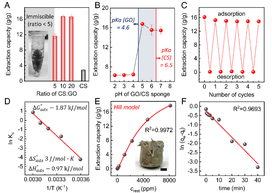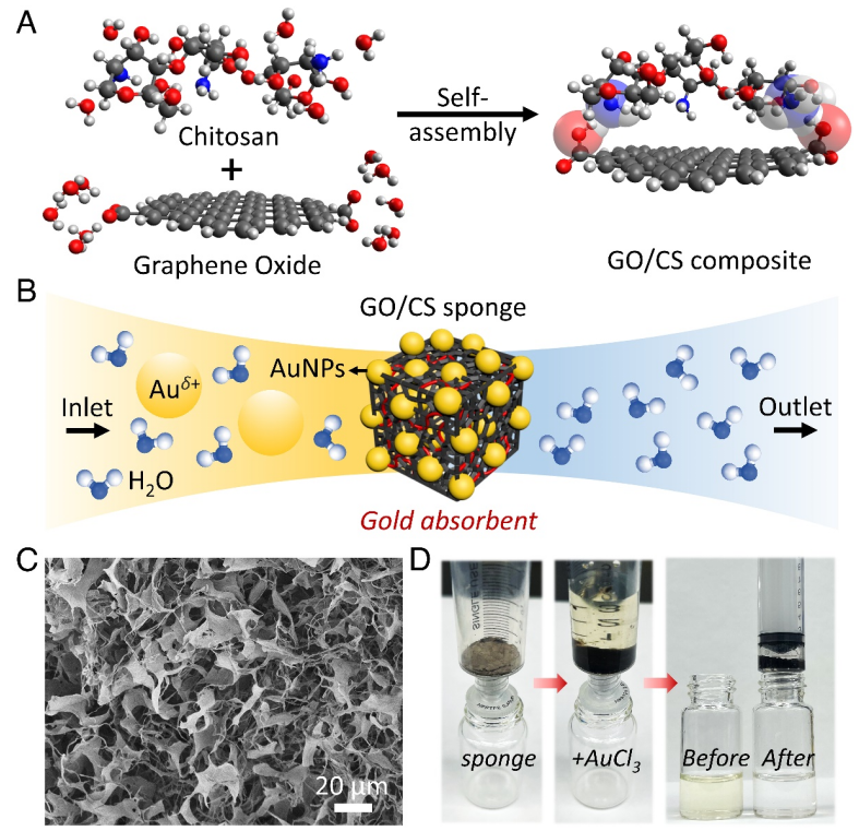 0 形式的方法,從而跳過了幾個技術步驟。我們通過二維氧化石墨烯和一維殼聚糖大分子的自組裝開發了一種納米級跨維復合材料,能夠同時作為金離子的清除劑和還原劑。這種多維結構不需要施加任何電壓來吸附和還原 Au,并且僅依賴于 Au 離子在異質 GO/CS 納米限制中的化學吸附動力學及其在多個結合位點上的化學還原。離子吸收中的協同現象是導致金提取效率極高的原因。Au