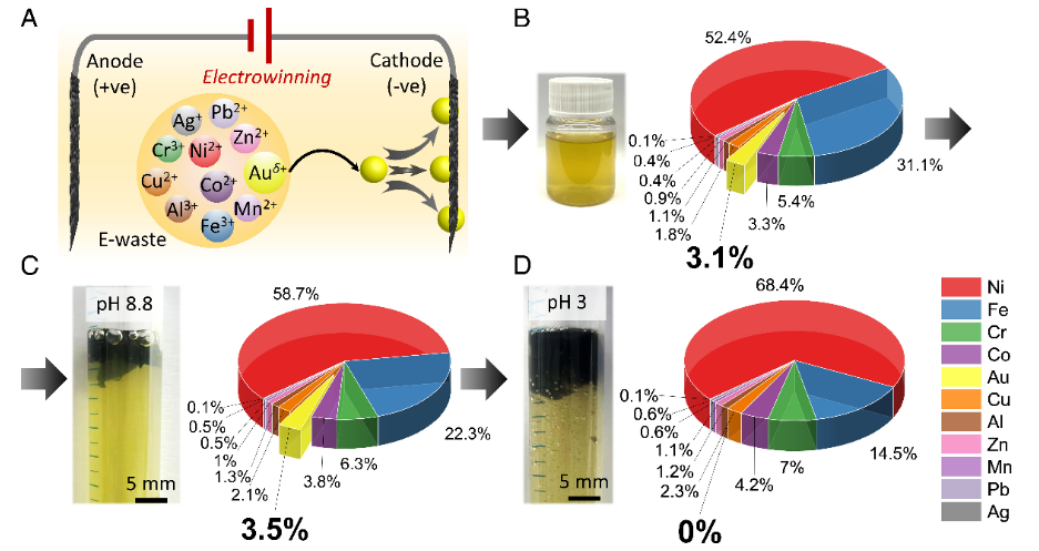 從電子垃圾 (e-waste) 中提取金 (Au) 既有環境影響,也有內在價值。電子垃圾處理不當會帶來環境和健康風險,帶來大量的補救和醫療保健成本。人們使用復雜的過程從電子垃圾中回收 Au,包括 Au 的溶解、在離子狀態下的吸附以及隨后還原成金屬 Au。這些過程本身很復雜,并且使用刺激性化學品,會加劇電子垃圾對環境的影響。在這里,提出了一種從電子垃圾中同時回收和還原 Au