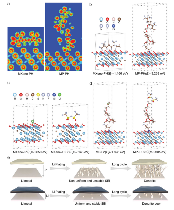 Fig 5. a) PH-MXene和PH-MP界面的電子局域函數圖。b) PH-MXene和PH-MP系統的界面結合能。c) MXene-Li+和MXene-TFSI系統的吸附能。d) MP-Li+和MP-TFSI系統的吸附能。e) 使用PH-Li和PH-Li-SN−2MP SPE進行剝離/沉積循環的示意圖。