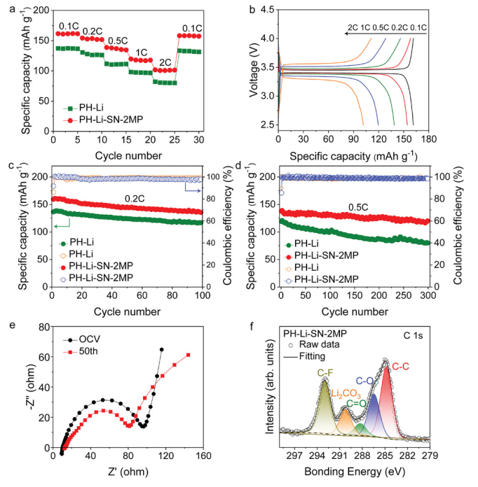 Fig 6. a) Li/PH-Li/LFP和Li/PH-Li-SN−2MP/LFP電池的倍率性能。b) Li/PH-Li-SN−2MP/LFP電池在不同倍率下的充放電曲線。c) Li/PH-Li/LFP和Li/PH-Li-SN−2MP/LFP電池在0.2 C下的循環性能。d) Li/PH-Li/LFP和Li/PH-Li-SN−2MP/LFP電池在0.5 C下的循環性能。e) Li/PH-Li-SN−2MP/LFP電池初始和50個循環后的EIS曲線。f) Li/PH-Li-SN−2MP/LFP全電池在0.5 C下50個循環后LFP陰極的C 1s核級區域的XPS圖譜。