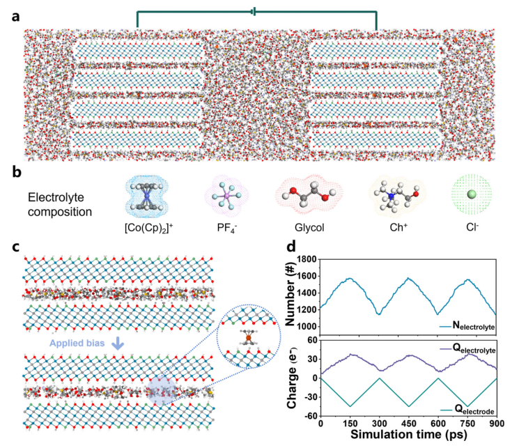 Fig 3. 茂金屬物種電化學插層過程的 MD 模擬。(a) 基于 MXene 的電化學插層構型的 MD 模擬模型示意圖。(b) 電解質組成的原子結構示意圖。(c) -1 V 中性和外加偏壓下的原子結構示意圖,右插圖顯示了位于 MXene 層之間的鈷烯分子的示意圖。(d) 電解質 N電解質的原子序數和 MXene 層之間的凈電荷隨電極上附加電荷的增加和減少而變化。