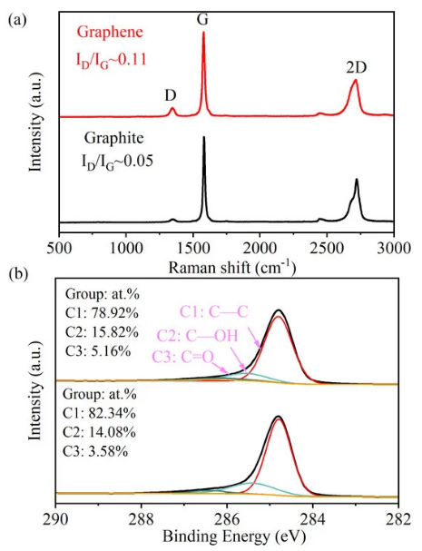 Fig 3. 原始石墨和石墨烯的 (a) 拉曼光譜和 (b) C1s XPS。