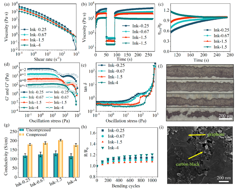 Fig 4. (a) 油墨粘度與剪切速率的關(guān)系;(b) 墨水的觸變性;(c) 油墨粘度的回收百分比;(d) 儲能模量 (G′) 和損耗模量 (G“) 隨剪切應(yīng)力的變化,其中實心和空心符號分別代表 G′ 和 G”;(e) 損失系數(shù) tan δ 與剪切應(yīng)力的函數(shù)關(guān)系;(f) 通過 100 μm 光學(xué)顯微鏡開口印刷在 PET 基材上的油墨細線的光學(xué)顯微鏡圖像 油墨通過 PET 基材上的絲網(wǎng)開口印刷的細線圖像,從上到下分別對應(yīng)于油墨 0.25、油墨 0.67、油墨 1.5 和油墨 4;(g) 熱壓前后印刷圖案的導(dǎo)電性;(h) 在 120° 彎曲角度下重復(fù)彎曲 1000 次期間,打印模型的相對電阻變化;() 使用 Ink-1.5 打印的細線的俯視圖 SEM 圖像。