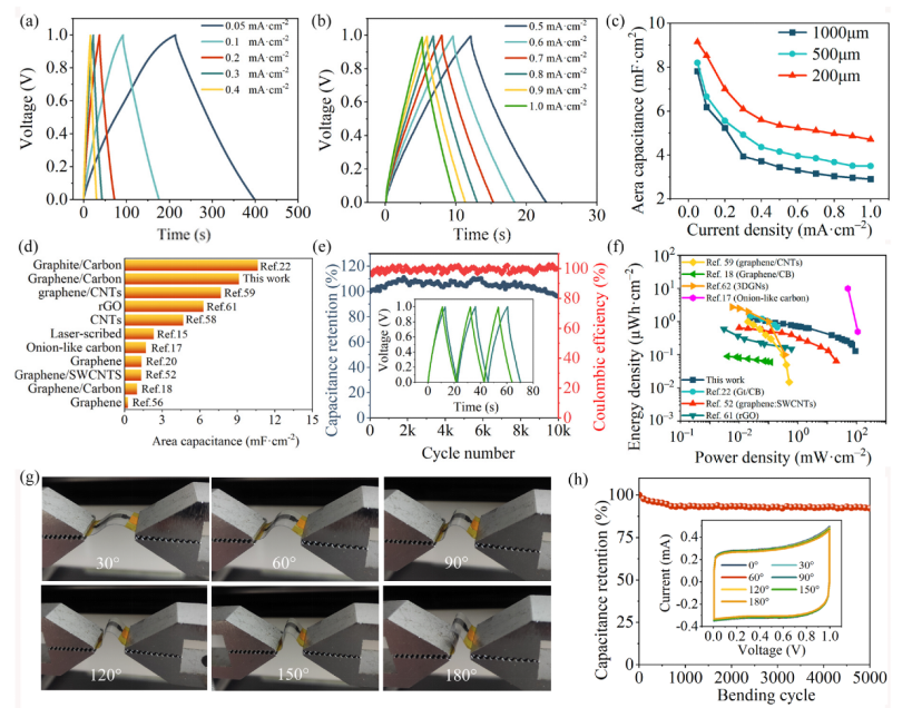 Fig 7. (a) 0.05–0.4 mA?cm-2 和 (b) 0.5-1.0 mA?cm-2 不同電流密度下的 GCD 曲線。(c) 電流密度為 0.05–1.0 mA?cm−2 的三種 MSC 的面電容。(d) 本研究與其他報道的印刷 MSC 的面積比電容比較。(e) MSC200 在 0.5 mA?cm-2 電流密度下的循環(huán)性能。(f) 能量密度和功率密度的 Ragone 圖。(g) MSC200 在不同彎曲角度下的照片。(h) MSC200 在 5000 次彎曲循環(huán)中的電容保持率。插圖:使用 200 mV?s−1 的掃描速率在不同彎曲角度下獲得的 CV 曲線。