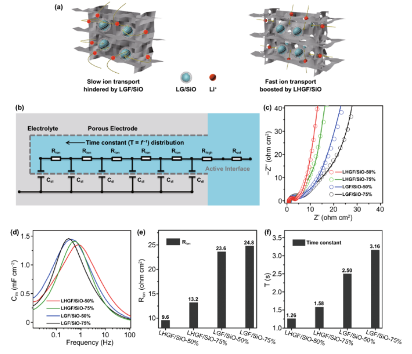 Fig 2. (a) LHGF/SiO和LGF/SiO電極中的Li?輸運(yùn)示意圖;(b) 多孔電極結(jié)構(gòu)示意圖和等效電路模型;(c)對(duì)稱(chēng)電極得到復(fù)合材料的Nyquist圖。符號(hào)和實(shí)線分別代表實(shí)驗(yàn)和模擬結(jié)果;(d) 各種復(fù)合電極在質(zhì)量負(fù)荷為11 mg cm?²時(shí);電容的虛部作為頻率的函數(shù)圖。(e) 不同復(fù)合電極的離子電阻(Rion)值;(f) 不同復(fù)合電極的時(shí)間常數(shù)(T)的函數(shù)值。
