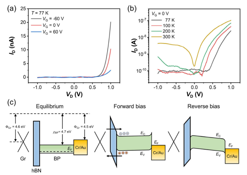 圖3. BP/hBN/Gr MIS二極管機構。(a) MIS器件的輸出曲線作為柵極偏置的函數。(b) 在不施加柵極偏置的情況下MIS二極管特性的溫度依賴性。(c) 解釋MIS二極管機理的帶示意圖。