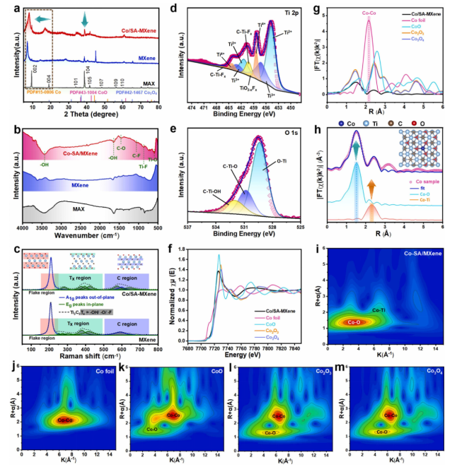 2-based MXene 和 Co-SA/MXene 的拉曼光譜。Co-SA/MXene 的 (d) Ti 2p,(e) O 1 s XPS 光譜。 (f) Co-SA/MXene 和對照樣的 Co K-edge 的歸一化 XANES 光譜。(g) Co-SA/MXene 和對照樣的 Co K-edge FT-EXAFS 光譜。(h) R 空間中 Co-SA/MXene 的 Co K-edge EXAFS 擬合曲線(插圖:Co-SA/MXene 的可能結構),以及 Co-SA/MXene 的 FT-EXAFS 光譜的第一、二殼(O、Ti)擬合結果。(i) Co-SA/MXene、(j) Co 箔、(k) CoO、(l) Co