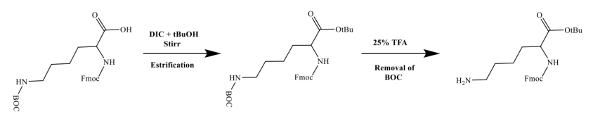 流程圖1. 利用叔丁基 (OtBu) 基團通過酯化作用保護 Fmoc-Lys(BOC)–OH 的游離羧酸,然后從 ε-胺中去除 BOC 基團。