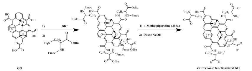 流程圖 2. 受保護的賴氨酸的 ε-胺與 GO(由 DIC 活化)進行酰胺偶聯,然后去除 Fmoc 和 OtBu 基團以形成 GO-Lys。