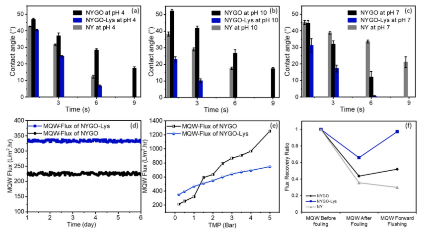 圖3. a、b、c分別為NY、NYGO和NYGO- lys膜在酸性、中性和基礎條件下的接觸角(接觸角越小越親水)。d:在0.1 bar條件下運行6天期間NYGO和NYGO- Lys的穩態通量曲線;e:隨著TPM的增加,NYGO和NYGO- Lys的通量曲線。f:以NY、NYGO、NYGO- Lys污染后和正沖洗后的MQW通量回收率(FRR)相對于污染前的初始通量為單位。