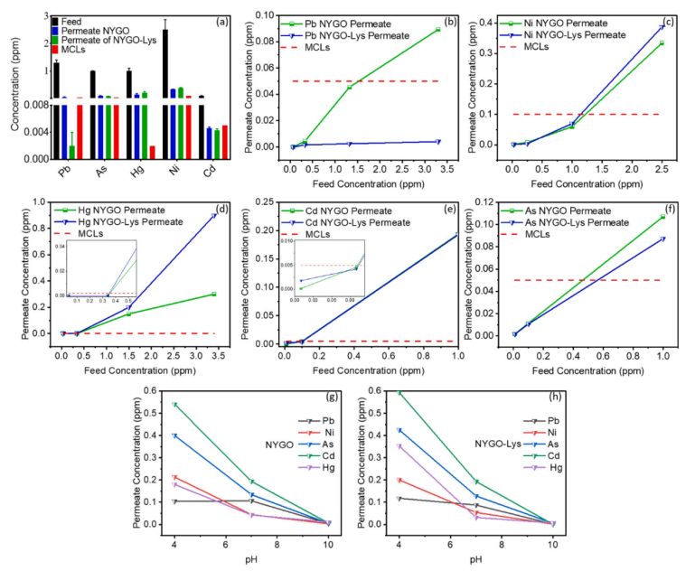 圖4. a:與MCLs相比,飼料中的金屬污染物以及NYGO和NYGO- Lys膜的滲透物的ICPMS數據。(b-f):表示NYGO和NYGO- Lys復合膜滲透液中Pb、Ni、Hg、Cd和As的殘留濃度隨進料濃度的變化趨勢,ERL位于趨勢線與MCLs的交點。(g和h) pH影響NYGO和NYGO- Lys復合膜在恒定進料濃度下保留金屬的能力,即所有進料濃度均為1ppm。