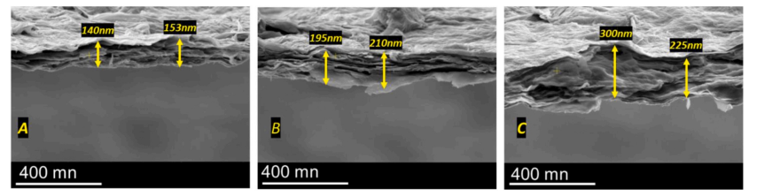 圖5. NYGO-Lys 復合膜的X 截面 SEM 圖像 (A–C) ,其負載質量分別為 0.3、0.42 和 0.71 mg/cm