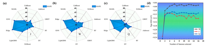 圖3. (a) 鋁基體 (b) 石墨烯/鋁完美界面和 (c) 石墨烯/鋁缺陷界面的平均絕對百分比誤差重要性雷達(dá)圖。(d) 特征去除曲線。