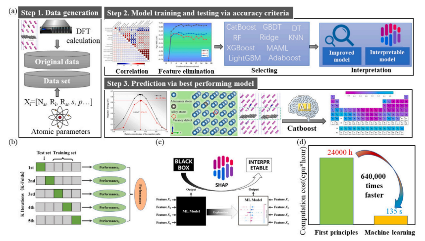 圖1. (a)機(jī)器學(xué)習(xí)過程中的步驟,(b)交叉驗(yàn)證圖,(c)SHAP可解釋模型,(d)機(jī)器學(xué)習(xí)方法和DFT計(jì)算的效率比較。