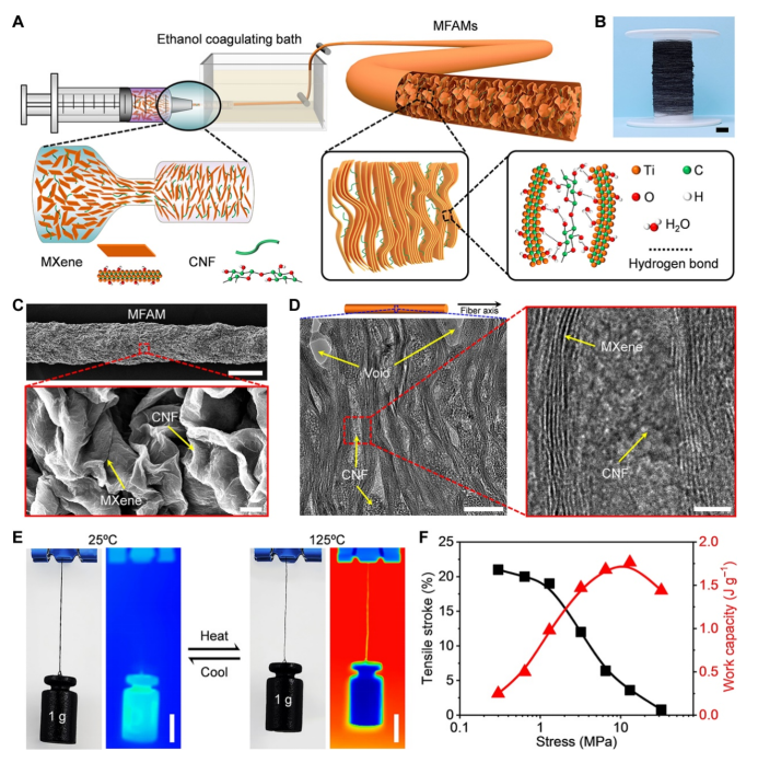 圖 1. MFAM 的制造和特性。(A) MFAM 制造示意圖。在顯著的拉伸應力下,混合 MXene/CNFs 納米片與 MFAM 纖維垂直排列。(B) 纏繞在卷軸上的一百米長的 MFAM 的照片。(C) MFAM 表面的 SEM 圖像。(D) MFAM 縱向剖面的 HR-TEM 圖像。(E) MFAM 在加熱和冷卻下的可逆收縮驅動的數碼照片和紅外熱圖像。(F) 拉伸行程和工作能力與施加在 MFAM 上的拉伸應力的關系。比例尺,1 厘米 (B)、100 微米 (頂部) 和 1 微米 (底部) (C)、50 納米 (左) 和 10 納米 (右) (D) 和 5 毫米 (E)。