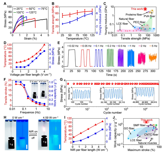 圖3. MFAM 的機械和驅動性能。(A) MFAM 在不同溫度下的典型應力-應變曲線。 (B) MFAM 在不同溫度下的拉伸強度和楊氏模量。 (C) MFAM 和已報道的聚合物纖維肌肉(包括 LCE 纖維、聚環氧乙烷 (PEO) 纖維、蛋白質纖維、聚乙烯醇 (PVA) 纖維和天然纖維)的拉伸強度與楊氏模量的比較。 (D) MFAM 產生的溫度和收縮驅動應力與施加的 0.05 Hz 方波直流電壓的關系。 (E) 當以 0.02 至 5 Hz 的頻率施加 4 V cm−1 方波直流電壓時,MFAM 的收縮驅動應力與時間曲線。 (F) 施加不同頻率的 4 V cm−1 方波直流電壓時,MFAM 在 0.64 MPa 負載下的拉伸行程和工作能力。插圖是當施加的直流電壓從 0 增加到 4 V cm−1 時拉伸收縮的光學照片。(G) 施加 4 V cm−1 的 1 Hz 方波直流電壓時,MFAM 的收縮驅動應力與循環數的關系。(H) 使用 808 nm NIR 激光向光纖表面傳送 4.59 W cm−1 的功率密度,在驅動之前和光熱驅動之后,MFAM 的光學照片 (左) 和紅外熱像 (右)。(I) 使用不同功率強度的 NIR 激光照射 MFAM 時產生的溫度和收縮驅動應力。 (J) MFAM 和已報道的非扭曲熱驅動纖維肌肉(包括 GO 纖維、LCE 纖維、SMP 纖維、CNTC 纖維和天然肌肉)的工作能力與最大沖程的比較。比例尺,5 毫米 (F)、5 毫米 (H)。