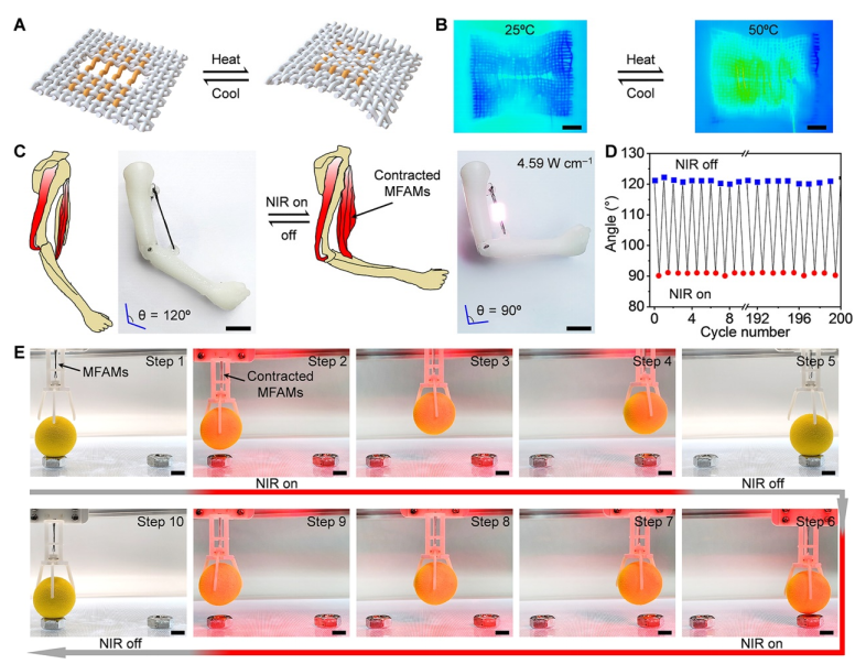 圖 4. MFAM 收縮驅動演示。(A) 用 MFAM 編織的紡織品示意圖,用于提供熱生可編程形狀變形。(B) 紡織品在 25° 和 50°C 下熱驅動的紅外熱圖像。(C) 由四個平行 MFAM 驅動的舉重假肢的示意圖和光學照片,這些假肢由 NIR 激光加熱。當 MFAM 暴露在 808 nm NIR 激光下時,它們會像手臂的二頭肌一樣收縮。(D) 顯示在 200 次重復的 NIR 激光驅動循環中肘部彎曲的角度的圖。(E) 八個平行 MFAM 組合在一起并應用于機器人夾持器,用于抓取、轉移、傳送和回收玩具球。比例尺,1 厘米 (B)、5 毫米 (C) 和 5 毫米 (E)。