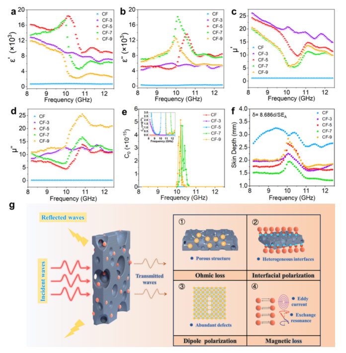 圖 5. (a)濉洹ⅲ╞)濉濉ⅲ╟)臁洹ⅲ╠)臁濉ⅲ╡)C0曲線,以及(f)Co納米粒子增強碳泡沫復合材料在X波段的趨膚深度。(g)復合材料屏蔽機制示意圖。