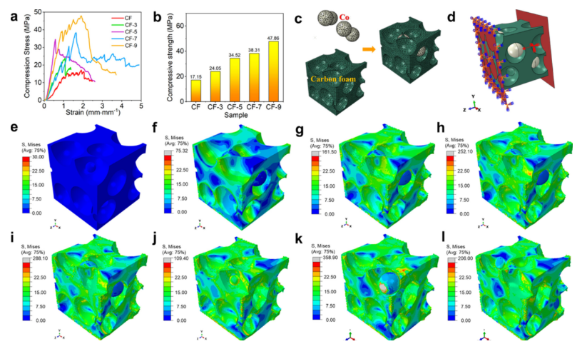 圖3. (a)原始碳泡沫和鈷納米粒子增強碳泡沫復合材料的壓縮應變-應力曲線和(b)壓縮強度。鈷納米粒子增強碳泡沫復合材料的有限元模型:(c)建模和網格;(d)負載和邊界條件。壓縮應變分別為(e)0%、(f)2.5%、(g)5%、(h)7.5% 和(i)10% 時 CF-7 樣品上的等效應力分布。壓縮應變為 10% 時 (j) CF-3、(k) CF-5 和 (l) CF-9 上的等效應力分布。