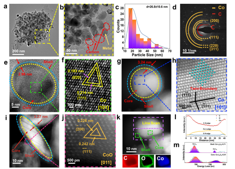 圖 2. Co 納米粒子增強碳泡沫復合材料 (CF-7) 的結構表征。(a) 復合材料的典型低倍 TEM 圖像。(b) a 中標記區域的局部放大 TEM 圖像。(c) 通過測量 80 多個納米粒子統計計算出 Co 納米粒子的尺寸分布。(d) 圖 S8b 的對應 SAED 圖案。(e) 具有核殼結構的單個 Co 納米粒子的 TEM 圖像。(f) b 中標記區域的對應高分辨率 TEM 圖像。(g–j) 沿 Co [101] 和 CoO [011] 觀察的低倍和原子分辨率 HAADF 圖像。(k) 選定區域的 EELS 映射,其中呈現 C k 邊、O k 邊和 Co L 邊,線輪廓和詳細的 Co L 邊分別顯示在 (l) 和 (m) 中。