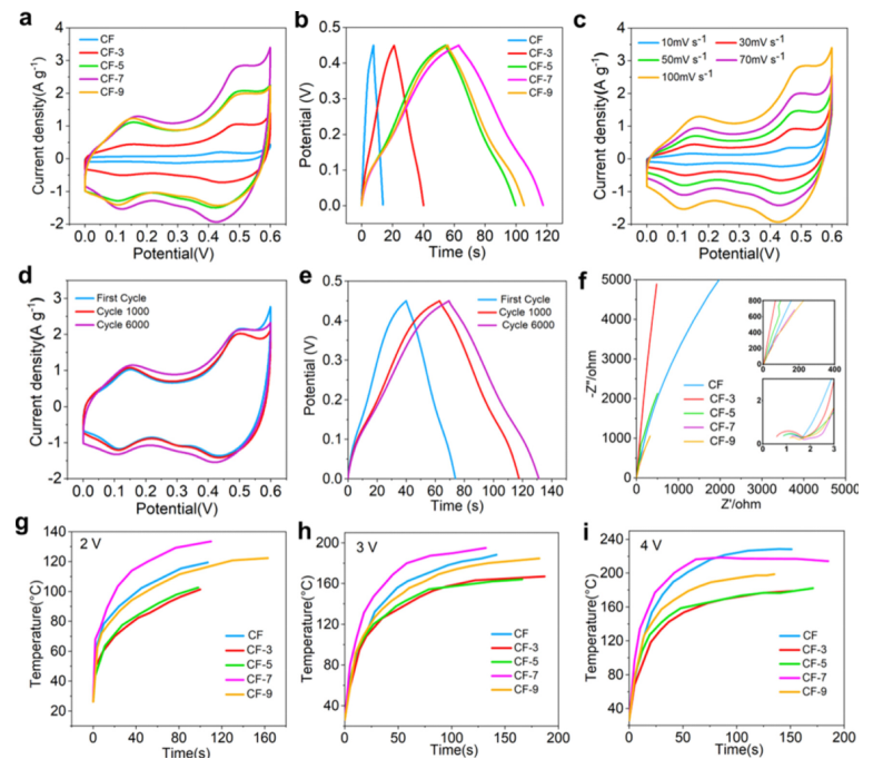 圖 6. 分別在相同掃描速率和電流密度下比較 Co 納米粒子增強碳泡沫復合材料的 (a) CV 曲線和 (b) GCD 曲線。(c) 不同掃描速率下樣品 CF-7 的 CV 曲線比較。在不同循環下比較樣品 CF-7 的 (d) CV 曲線和 (e) GCD 曲線。(f) Co 納米粒子增強碳泡沫復合材料的 EIS 測量值比較。Co 納米粒子增強碳泡沫復合材料在不同電壓下的光熱性能:(g) 2 V、(h) 3 V 和 (i) 4V。