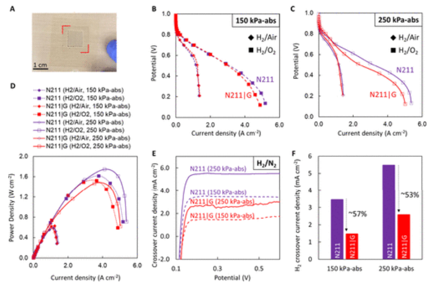 2燃料電池中運行的性能。(A) N211 | G樣品在涂上催化劑墨水之前的圖像,石墨烯角用紅線表示。N211和N211 | G膜的有效面積(由Kapton窗口定義)為∼1 cm