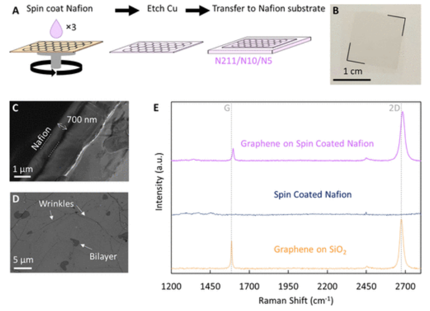 圖1. 石墨烯與Nafion 211和PTFE增強Nafion薄膜的界面連接。(A) 石墨烯轉移過程示意圖。將薄的Nafion層(∼700 nm厚)旋涂到銅箔上的CVD石墨烯上,蝕刻Cu,并將Nafion–石墨烯堆棧舀到所需的Nafion載體上(N211,∼25μm厚;N10,∼10μm厚;N5,∼5μm厚)。(B) 轉移到Nafion 211的厘米級石墨烯的光學圖像(黑線是指示石墨烯邊緣的眼睛引導線)。(C) 銅箔上石墨烯上自旋包覆Nafion層的SEM橫截面圖像(白色虛線只是一個視覺指南)。(D) 旋轉包覆Nafion薄膜上石墨烯的SEM圖像顯示了CVD石墨烯的褶皺和較小的雙層斑塊特征。石墨烯無破裂或大/宏觀損傷表明轉移質量高。(E) 在300 nm SiO
