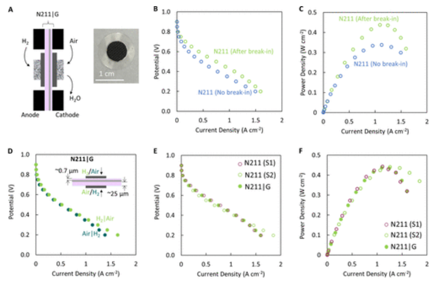 2,綠色曲線)或陰極(空氣,藍色曲線)時,N211 | G膜的極化曲線。有關石墨烯膜相對于輸入氣體的方向,請參見插圖示意圖。當膜取向改變時,只觀察到邊緣差異。(E) 兩個單獨的N211控制膜(空的紅色和綠色圓圈)和N211 | G膜(填充的綠色圓圈)的極化曲線和(F)功率密度曲線。同樣,這些膜的H
