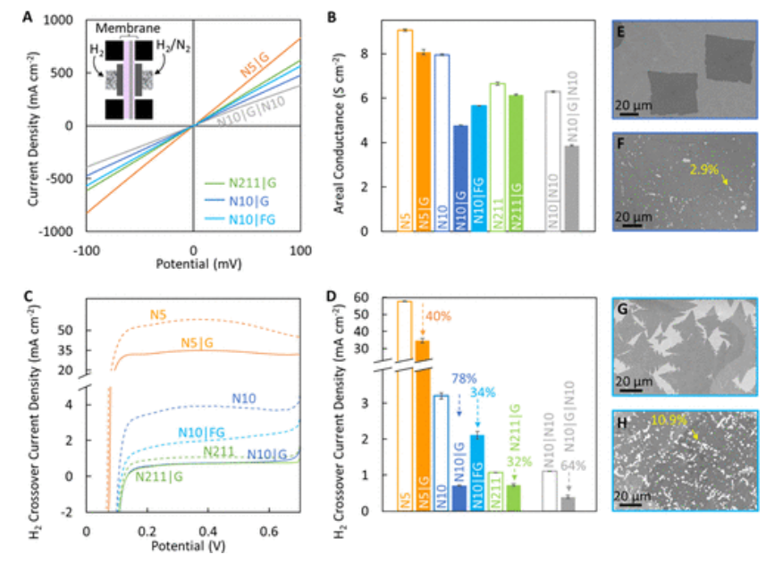 滲透-選擇性權衡是聚合物膜固有的。在燃料電池中,較薄的質子交換膜(PEM)可以實現更高的質子電導和更高的功率密度,同時具有更低的面積比電阻(ASR)、更小的歐姆損耗和更低的離聚物成本。然而,隨著厚度的減小,有害物種交叉的性能和長期效率增加。在這里,我們表明,將通過可伸縮化學氣相沉積(CVD)和可調缺陷密度合成的原子薄單層石墨烯并入PEM(Nafion,∼5–25μm厚)可允許減少H