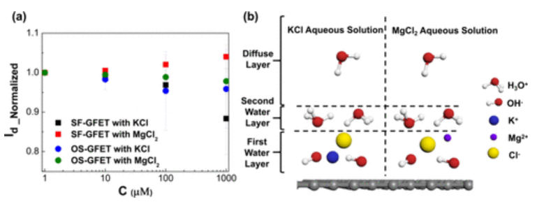 圖5.(a) SF-GFET在KCl和MgCl2濃度為1μM、10μM、100μM和1 mM的電解液中的恒電壓漏電流。(b)氯化鉀水溶液和氯化鎂水溶液中表面離子的分布。為清楚起見,它僅以離子狀態表示。
