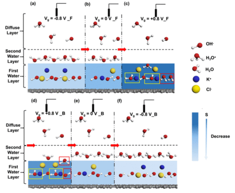 圖7.SF-GFET與1μM KCl電解質溶液在不同柵極電壓下的界面演變示意圖。右邊的色條顯示第一個水層中懸掛的水分子“S”的布居程度。懸水(S)分布在深藍色時增強,而在淺藍色時減弱。為清楚起見,2D HBN和離子水合簇僅以離子狀態表示:(a)前向掃描路徑處的Vg=−0.8 V。(b) 前向掃描路徑處的Vg=0 V。(c) Vg=正向掃描路徑處的0.8 V。(d) Vg=反向掃描路徑處的0.8 V。(e) 在后向掃描路徑處,Vg=0 V。(f) Vg=−0.8 V,位于后向掃描路徑。