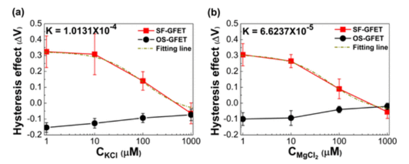 圖3. SF-GFET和OS-GFET在1、10和100μM電解液中石墨烯輸運行為的比較。(a) SF-GFET和OS-GFET在KCl水溶液中的滯后效應(ΔV)。(b) SF-GFET和OS-GFET在MgCl2水溶液中的滯后效應(ΔV)。