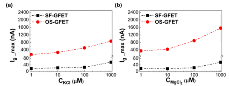 圖4. SF-GFET和OS-GFET在1、10和100μM電解液中石墨烯輸運行為的比較。(a) SF-GFET和OS-GFET在KCl水溶液中的最大柵電流。(b) SF-GFET和OS-GFET在MgCl2水溶液中的最大柵電流。黑色矩形和紅色圓圈分別顯示SF-GFET和OS-GFET的最大柵電流值。