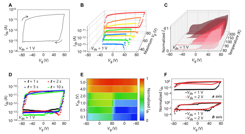 圖4. (A) ACPS裝置沿軸的Vg相關滯后傳遞曲線。(B) ACPS裝置沿具有變化的最大Vg的軸的傳輸曲線。(C)ACPS裝置在300、150、100、90和80 K的不同溫度下沿軸的歸一化傳輸曲線。(D)ACPS裝置沿具有每個Vg點的不同施加脈沖時間(t)的軸的傳輸曲線。(E) 沿具有不同Vds的ACPS裝置的a軸的傳遞曲線的熱圖。(F) 不同Vds下ACPS片沿a軸和b軸的歸一化傳輸曲線。