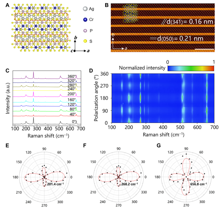 圖2. (A) ACPS的俯視晶體結構。(B) 顯示為d(050)和d(34)的ACPS HAADF-STEM圖像)。插圖為(A)所示的重疊晶體結構。比例尺,2 nm。(C) ACPS薄片的偏振拉曼光譜。(D) 360°偏振拉曼光譜的強度圖。(E至G)拉曼強度201.4、268.2和656.8 cm−1的極性圖。黑點代表偏振拉曼光譜的實驗結果,紅色實線對應理想曲線。